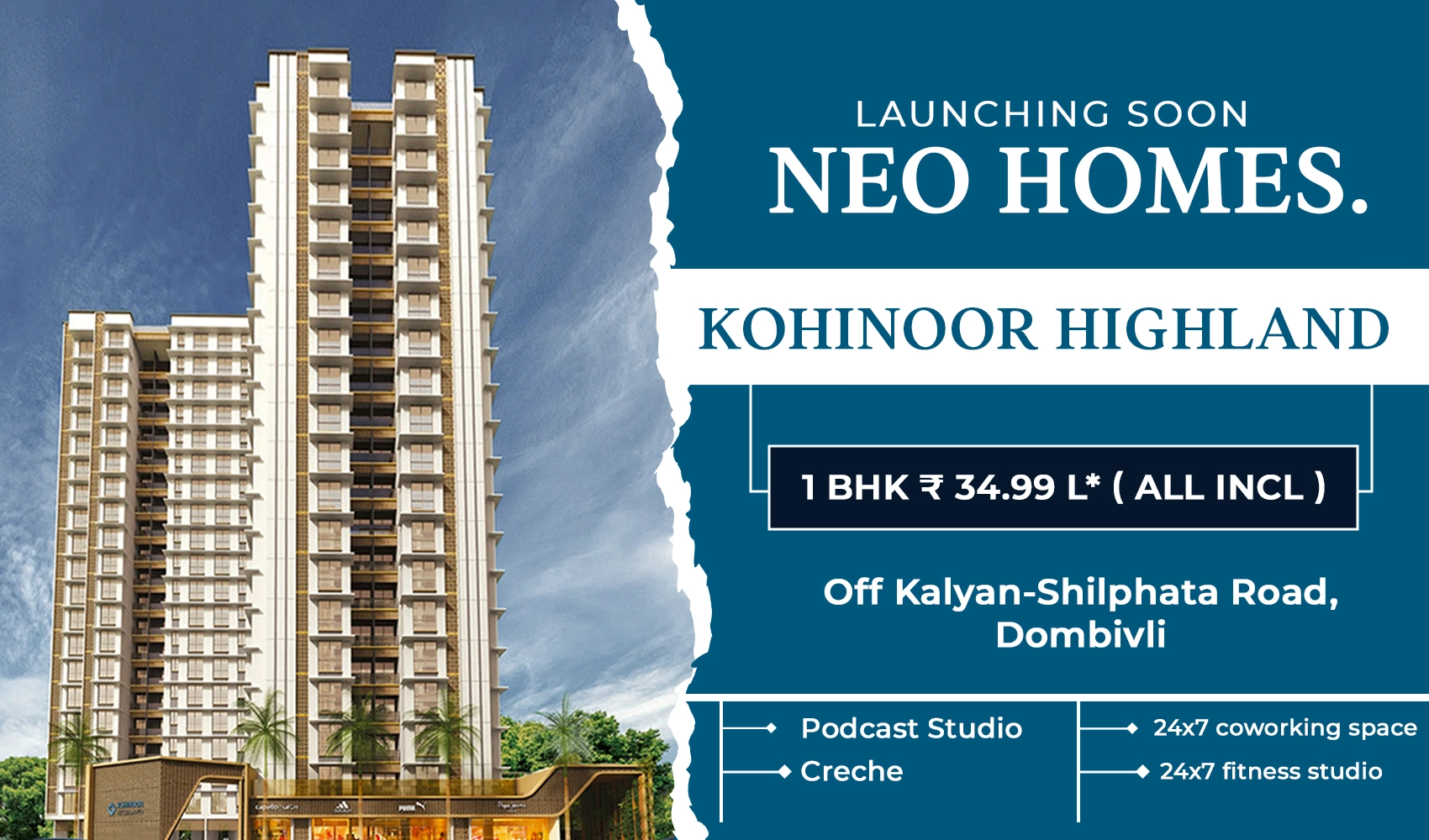 Nestled in the heart of Usarghar, Dombivli, Kohinoor Highland Dombivli, a prestigious venture by the renowned Kohinoor Group, stands as an epitome of modern living. Comprising three majestic towers, each soaring an impressive 19 storeys high, this project is a testament to sophistication and comfort. Discover over 600 meticulously designed units within Kohinoor Highland Dombivli, a hallmark development by Kohinoor Group, offering spacious 1 & 2 BHK residences alongside inviting commercial spaces. Whether you are in search of a cozy abode or a promising commercial property, Kohinoor Highland Dombivli, crafted by the esteemed Kohinoor Group, caters to your diverse needs effortlessly. Convenience meets connectivity at Kohinoor Highland Dombivli by Kohinoor Group. Situated strategically, this development ensures seamless access to essential amenities, fulfilling residents daily requirements with ease. Embrace a lifestyle where comfort meets luxury, where convenience intertwines with connectivity—welcome to Kohinoor Highland Dombivli by the prestigious Kohinoor Group, your gateway to a vibrant living experience in Usarghar, Dombivli.